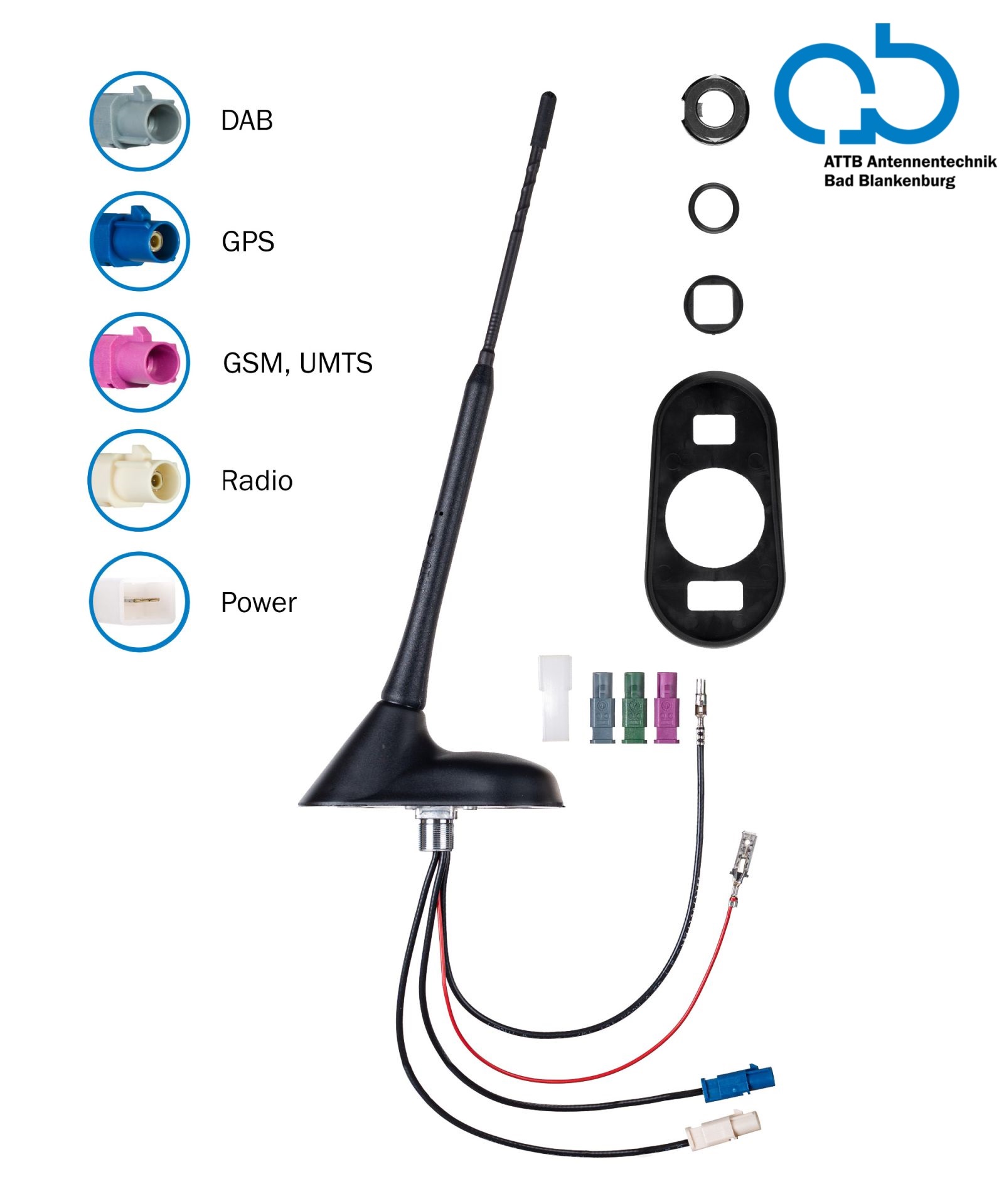 Dakantenne AM/FM DAB+, DVB T, GPS<br>ATTB “Made in Germany” 3793.01<br> <br>Antennentechnik Bad Blankenburg staat al sinds 1919 met eigen onderzoek, ontwikkeling en productie voor radiografische netwerkoplossingen van de hoogste kwaliteit en betrouwbaarheid “Made in Germany”.<br> <br>Betrouwbare en krachtige antennes met optimale signaalkwaliteit zijn onmisbaar voor communicatie, infotainment, navigatie en het netwerken en besturen van machines met communicatiestandaarden zoals 5G, LTE, UMTS, GSM, WLAN, BT, GPS, DAB+ en TETRA.<br> <br>Naast standaardoplossingen omvat het ATTB-assortiment ook speciale ontwikkelingen en toepassingen op maat, onder andere voor de auto-industrie.<br> <br>Nauwe samenwerking op het gebied van onderzoek en ontwikkeling met toonaangevende organisaties en onderzoeksinstellingen heeft geresulteerd in meer dan 40 patenten en talrijke innovaties.<br> <br>Het hele productieproces voor het brede assortiment voertuigantennes en antenneaccessoires voor veel populaire voertuigen is gecertificeerd volgens de normen van de auto-industrie en de kwaliteit van de antennes wordt voortdurend gecontroleerd met behulp van onze eigen meetstations, van productontwikkeling tot lopende productie en eindinspectie.<br> <br>verdere info volgt<br><strong><br>Geschikt voor:</strong><br>AM FM DAB DAB+ <br>