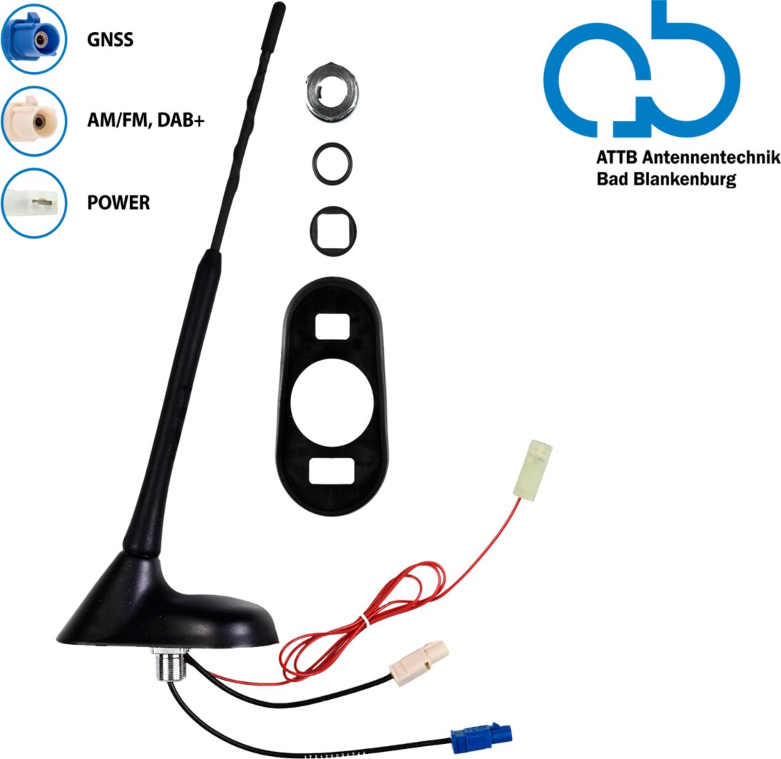 Dakantenne AM/FM DAB+* GNSS (GPS/GLOASS/Galileo/BeiDou)<br>ATTB “Made in Germany” 3731.01<br> <br>Antennentechnik Bad Blankenburg staat al sinds 1919 met eigen onderzoek, ontwikkeling en productie voor radiografische netwerkoplossingen van de hoogste kwaliteit en betrouwbaarheid “Made in Germany”.<br> <br>Betrouwbare en krachtige antennes met optimale signaalkwaliteit zijn onmisbaar voor communicatie, infotainment, navigatie en het netwerken en besturen van machines met communicatiestandaarden zoals 5G, LTE, UMTS, GSM, WLAN, BT, GPS, DAB+ en TETRA.<br> <br>Naast standaardoplossingen omvat het ATTB-assortiment ook speciale ontwikkelingen en toepassingen op maat, onder andere voor de auto-industrie.<br> <br>Nauwe samenwerking op het gebied van onderzoek en ontwikkeling met toonaangevende organisaties en onderzoeksinstellingen heeft geresulteerd in meer dan 40 patenten en talrijke innovaties.<br> <br>Het hele productieproces voor het brede assortiment voertuigantennes en antenneaccessoires voor veel populaire voertuigen is gecertificeerd volgens de normen van de auto-industrie en de kwaliteit van de antennes wordt voortdurend gecontroleerd met behulp van onze eigen meetstations, van productontwikkeling tot lopende productie en eindinspectie.<br> <br>DAB+ ontvangst met optionele antennesplitter*<br> <br>Bij ontvangstproblemen:<br> <br>controleer antennekabel en antenneadapter<br>controleer voertuig op fouten door retrofit LED-verlichting<br>controleer het voertuig op defecten als gevolg van retrofit spanningsomvormers / voedingseenheden / USB-laadadadapter<br>controleer het voertuig op fouten als gevolg van retrofit digitale vermogensversterkers<br> <br>Om de ontvangst van antennes te optimaliseren, moet u tijdens de installatie altijd zorgen voor een optimale aarding van de antennevoet of de aardingsband.<br> <br>Verwijder bestaande verf op de contactpunten met werkplaatsgereedschap en bescherm tegen corrosie met geschikte contactpasta en behandel ook de draad van de antennestaaf en de antennevoet om het contact te optimaliseren.<br> <br>Toepassing:<br>Dakantenne voor radio-ontvangst<br>Productkenmerken:<br>Geluidsarme antennestaaf: 230 mm<br>Actieve GNSS-antenne: Fantoomvoeding<br>Type kabel: RG 174<br>Diensten: AM/FM / DAB+ / GNSS / GPS<br>Connectoren: Fakra B(m) / Fakra C(m)<br>Aansluitingen:<br>AM/FM DAB+: Fakra B(m) wit RG174 / L=110 mm<br>GNSS: Fakra C(m) blauw RG174 / L=150 mm<br>externe voeding: bladaansluiting 6,3 mm<br>Frequentiebereik:<br>AM: 150 kHz – 1710 kHz<br>FM: 87,5 MHz – 108 MHz<br>DAB+ BIII: 174 MHz – 230 MHz<br>DAB+ L: 1452 MHz – 1492 MHz<br>GNSS: 1575,2 MHz / 1602 MHz – 1610 MHz<br>Versterking (dB):<br>AM: 6 dB<br>FM: 14 dB<br>DAB+ BIII: 10 dB<br>DAB+ L: 0 dB<br>GNSS: 28 dB +/- 3 dB<br>Voordeel (dBi):<br>GNSS: 32 dBi<br>Voeding:<br>AM: +12 V extern<br>FM: +12 V extern<br>DAB+: +12V extern<br>GNNS: +3V – +5,5V fantoomvoeding<br>Stroomverbruik:<br>AM: 15 mA > 40 mA max.<br>FM: 20 mA > 30 mA max.<br>DAB+ BIII: 20 mA > 30 mA max.<br>DAB+ L: 0 mA<br>GNSS: 15 mA > 40 mA<br>Impedantie:<br>AM/FM: 50 Ohm<br>DAB+: 50 Ohm<br>GNSS: 50 Ohm<br>VSWR:<br>AM: <3,0:1<br>FM: <2,0:1<br>DAB+ BIII: <2,0:1<br>DAB+ L: 1,8:1<br>GNSS: 1,5:1<br>Optioneel:<br>AM/FM:<br>Antennekabel verlenging Fakra B(f)>DIN(m) 500cm > item: 15-7581185<br>Antennekabel verlenging Fakra Z(f)>Fakra Z(f) 500cm > artikel: 15-7581195<br>Antenne adapterFakra Z(m)>DIN(m) passief LEONI/ROKA > artikel: 1524-01<br>GNSS:<br>Antennekabel verlenging Fakra(f)>Fakra(f) 500cm ROKA > artikel: 1526-500-1 <br>Adapter antenne Fakra C(m)>GT5-1S-HU(f) LEONI/ROKA > item: 1502-61-1<br>Antenne adapter Fakra C(m)>GT16(f) PioneerLEONI/ROKA > artikel: 1502-62-1 <br>*DAB+ ontvangst met optionele antennesplitter:<br>Antennesplitter AM/FM DAB+ DIN(f)>DIN(m)/SMB(f) passiv > item: 153-4724-02<br>Antennensplitter AM/FM DAB+ Fakra(m)>DIN(m)/SMB(f) passiv > item: 153-4724-05<br><strong><br>Geschikt voor:</strong><br>AM FM DAB DAB+ <br>