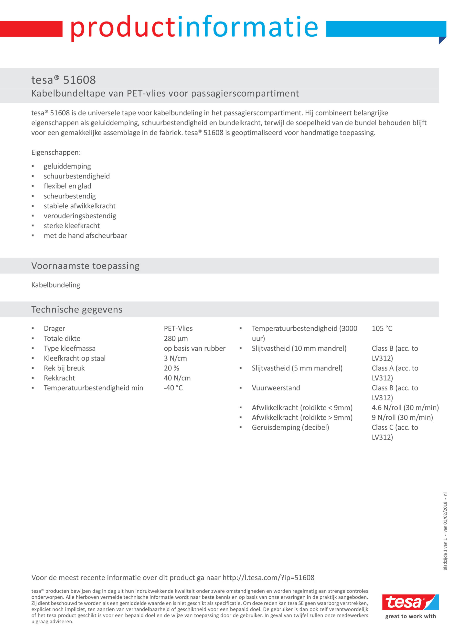 Kabelbundeltape van PET-vlies voor passagierscompartiment<br>Productbeschrijving<br>tesa® 51608 is de universele tape voor kabelbundeling in het passagierscompartiment. Hij combineert belangrijke eigenschappen als geluiddemping, schuurbestendigheid en bundelkracht, terwijl de soepelheid van de bundel behouden blijft voor een gemakkelijke assemblage in de fabriek. tesa® 51608 is geoptimaliseerd voor handmatige toepassing.<br> Eigenschappen:<br>•geluiddemping<br>•schuurbestendigheid<br>•flexibel en glad<br>•scheurbestendig<br>•stabiele afwikkelkracht<br>•verouderingsbestendig<br>•sterke kleefkracht<br>•met de hand afscheurbaar<br>Technische eigenschappen<br>Drager: PET-Vlies <br>Totale dikte: 280 µm<br>Type kleefmassa: op basis van rubber <br>Kleefkracht op staal: 3 N/cm<br>Rek bij breuk: 20 %<br>Rekkracht: 40 N/cm<br>Temperatuurbestendigheid min: -40 °C<br>Temperatuurbestendigheid (3000 uur): 105 °C<br>Slijtvastheid (10 mm mandrel) Class B (acc. to LV312) <br>Slijtvastheid (5 mm mandrel) Class A (acc. to LV312) <br>Vuurweerstand Class B (acc. to LV312) <br>Afwikkelkracht (roldikte < 9mm) 4.6 N/roll (30 m/min)<br>Afwikkelkracht (roldikte > 9mm) 9 N/roll (30 m/min)<br>Geruisdemping (decibel) Class C (acc. to LV312) <br><strong><br>Geschikt voor:</strong><br>Kabelbundel Tape<br>